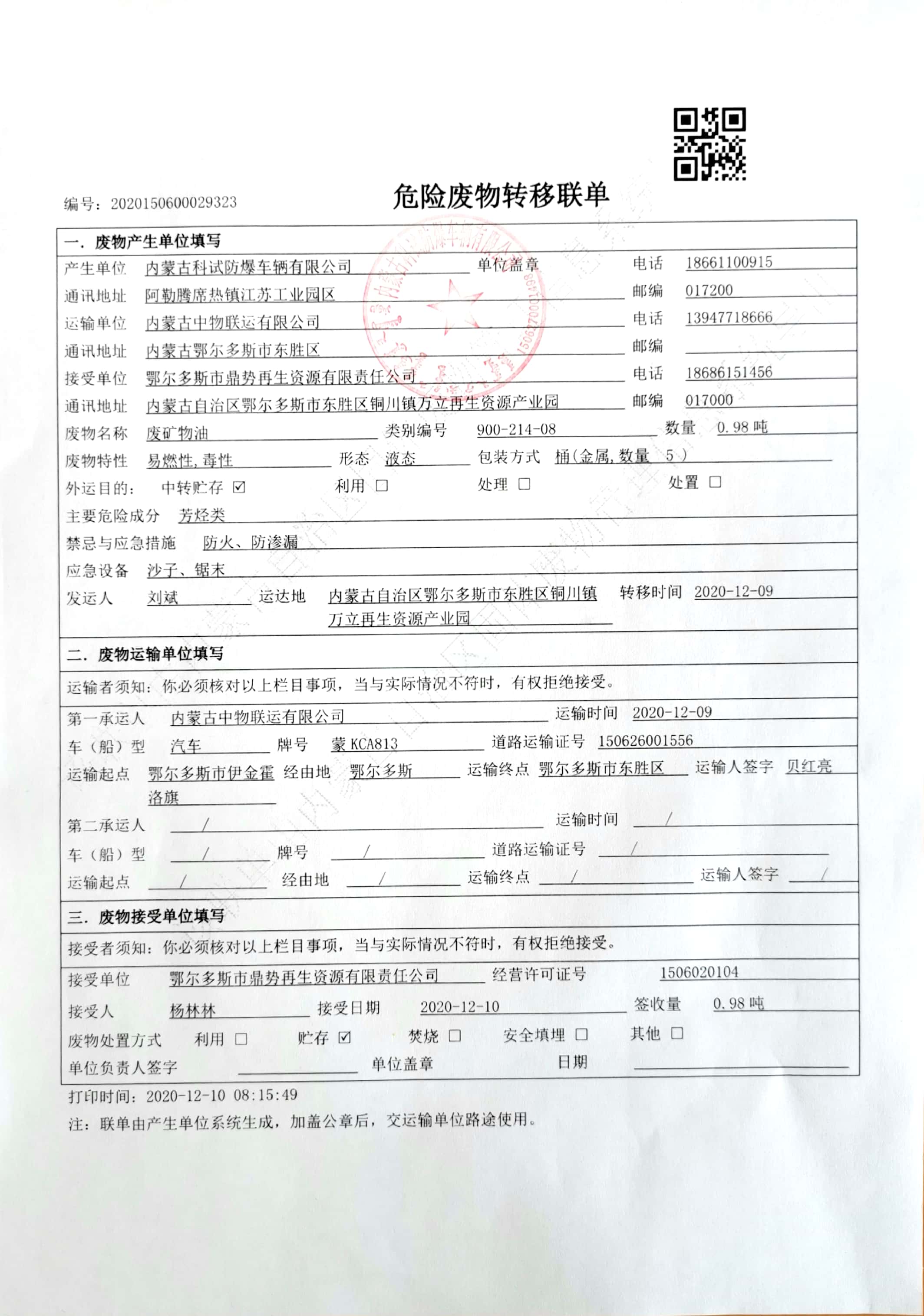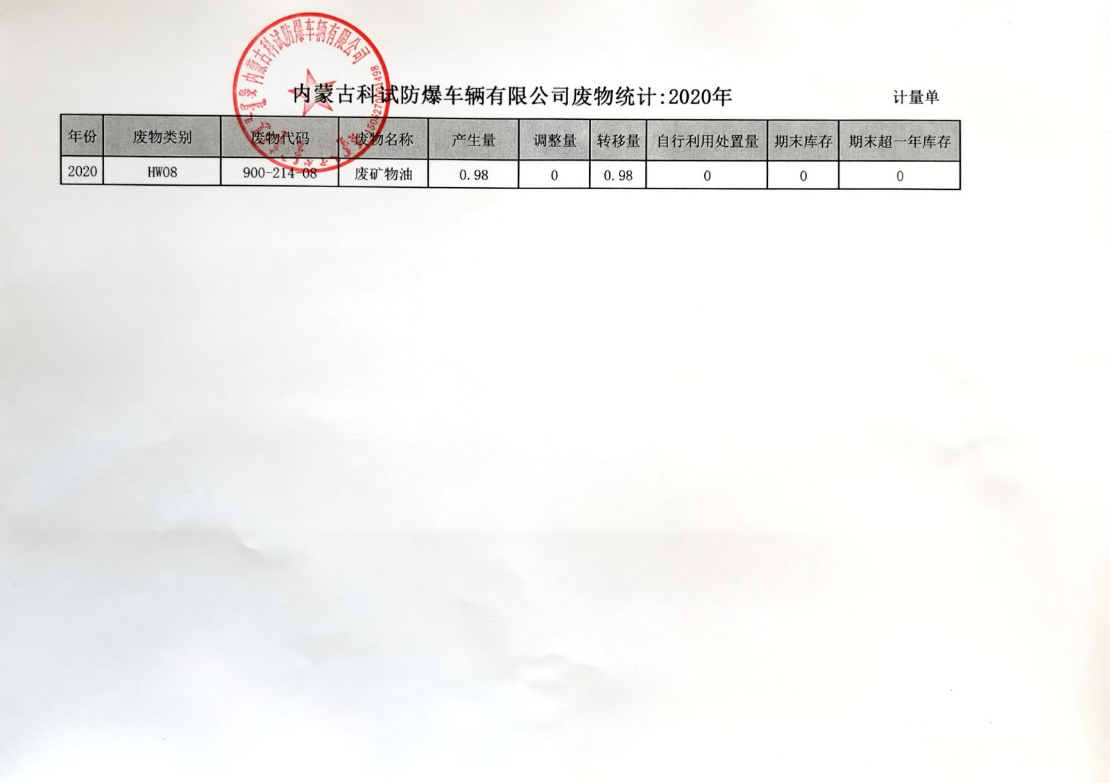 內(nèi)蒙古科試防爆車輛有限公司危險(xiǎn)廢物信息公示-2020年