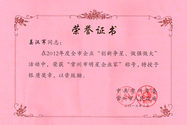 新年公司捷報(bào)頻傳。公司榮獲“工業(yè)四星企業(yè)”的榮譽(yù)稱號(hào),公司董事長(zhǎng)兼總經(jīng)理姜漢軍被常州市委、市政府授予“工業(yè)明星企業(yè)家”的榮譽(yù)稱號(hào)。