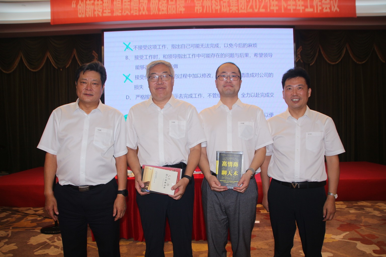 7月22日~25日,常州科試集團(tuán)2021年下半年工作會議在安徽池州隆重召開,總裁姜漢軍、副總裁王眉林、關(guān)金學(xué)、顧祖全等公司全體中高層管理者共66人出席了會議。會議的主要內(nèi)容是總結(jié)2021年上半年工作,分析當(dāng)前企業(yè)內(nèi)外經(jīng)營形勢,并對下半年經(jīng)營發(fā)展的目標(biāo)及重點工作作出安排部署。